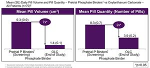 • Ahead of enrolling in the trial, patients took a mean of 8.3 pills/day of phosphate binders, compared to a mean of 3.9 OLC pills/day at study end (Figure 1)